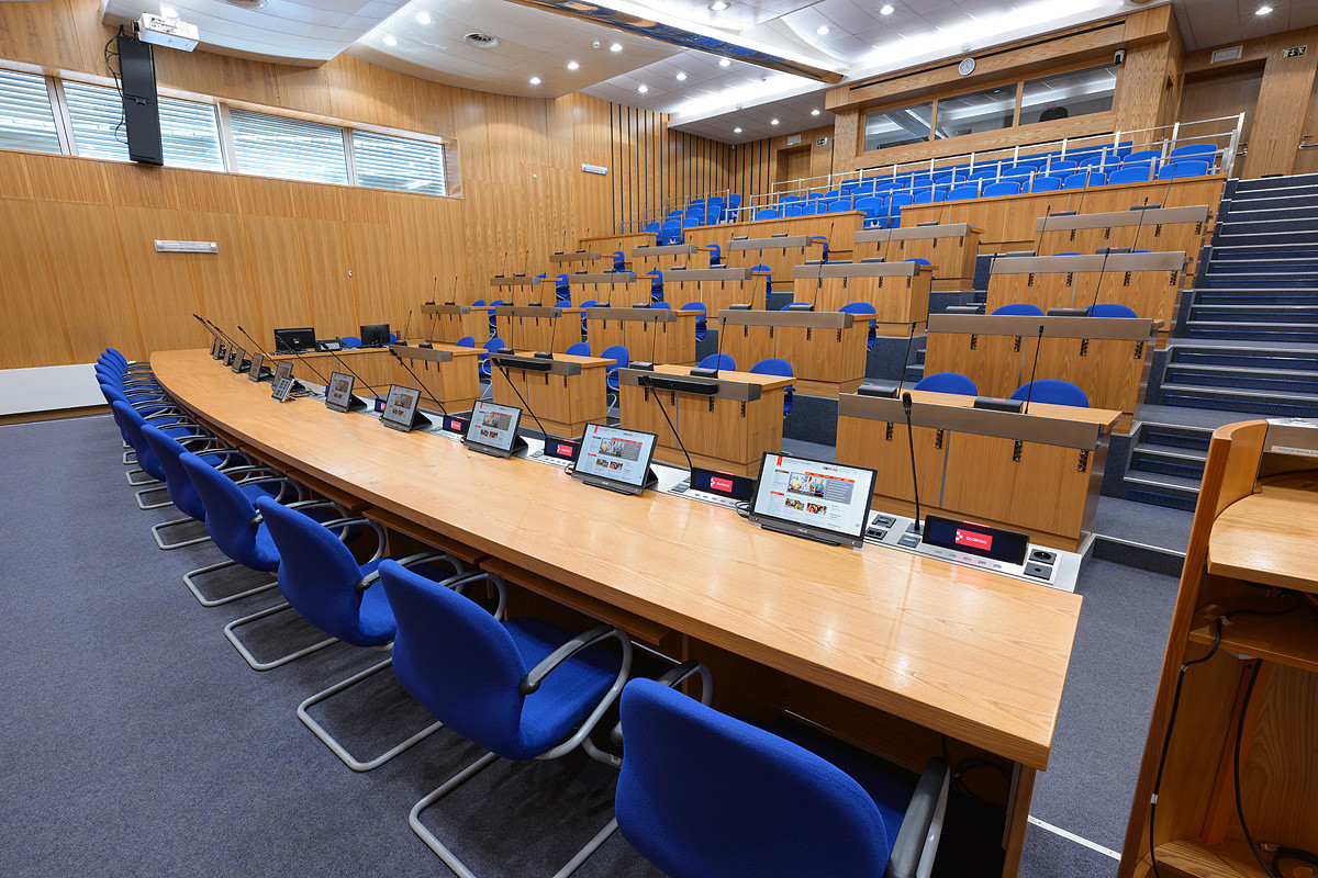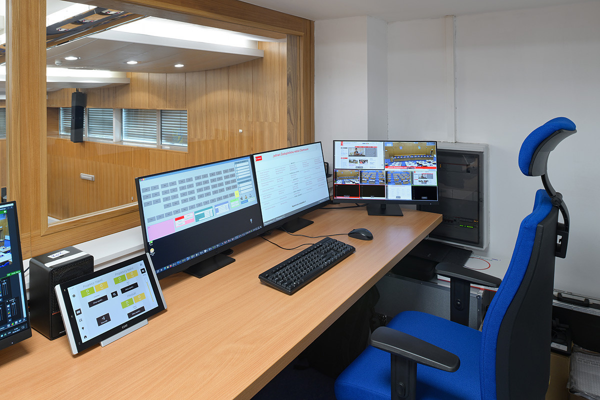 Vzhledem k tomu, že bylo k dispozici více technologií (od hlasovacích systémů a projekcí až po streamování a zvuk), byl klíčový úkol jasný: sjednotit ovládání do jediného, uživatelsky přívětivého rozhraní, které umožní bezproblémovou správu celého prostředí, a to jak z podlah, tak z technické řídicí místnosti.