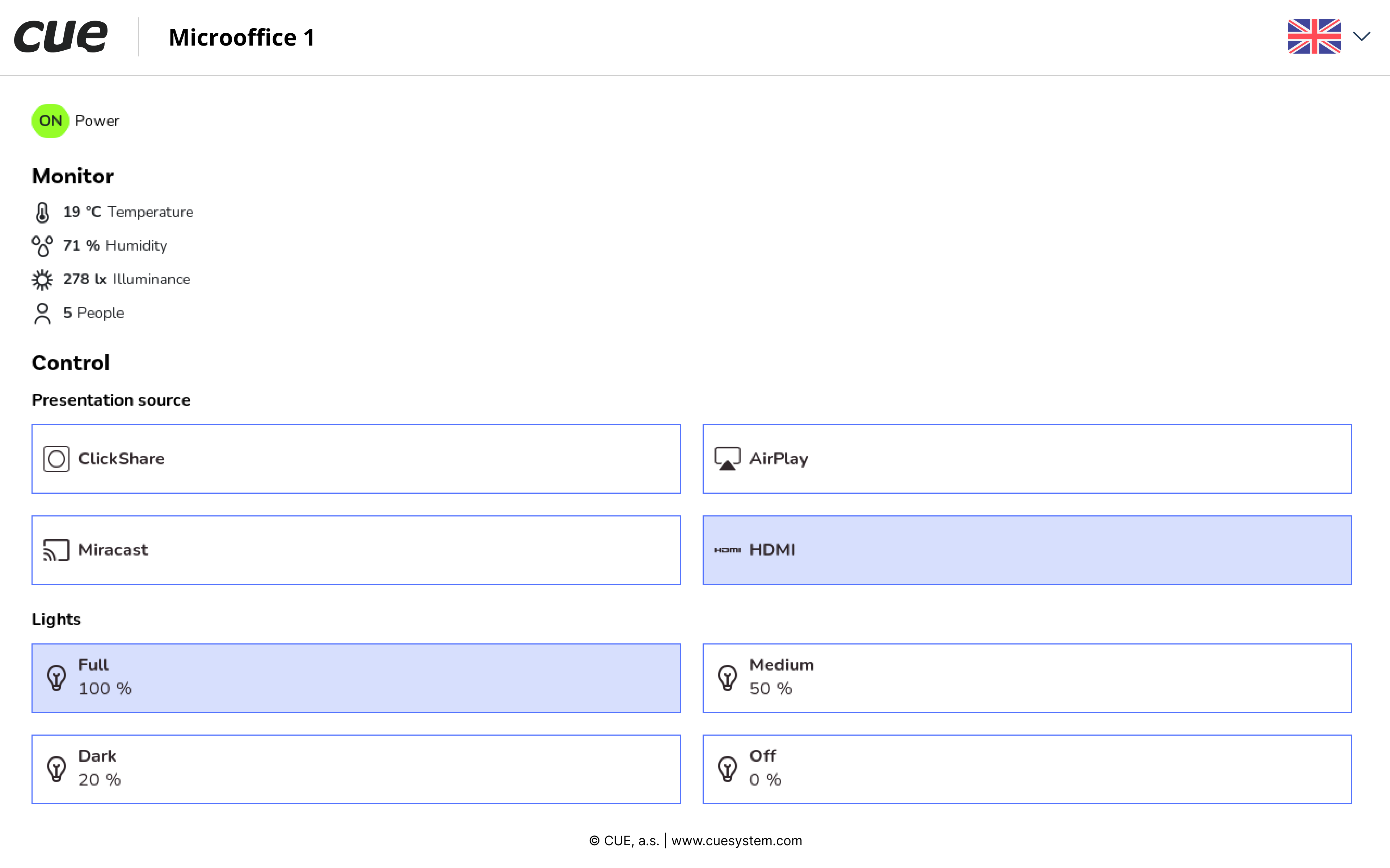 The web application provides graphical elements that allow users to monitor and control various room technologies. Typical functions include turning the monitor or projector on/off, adjusting lighting levels, setting temperature or HVAC modes, controlling blinds or other peripherals, etc. Communication between the web application and devices is implemented via CUE controllers using IP-based protocols, serial channels, infrared ports, digital IOs, relays, etc.
