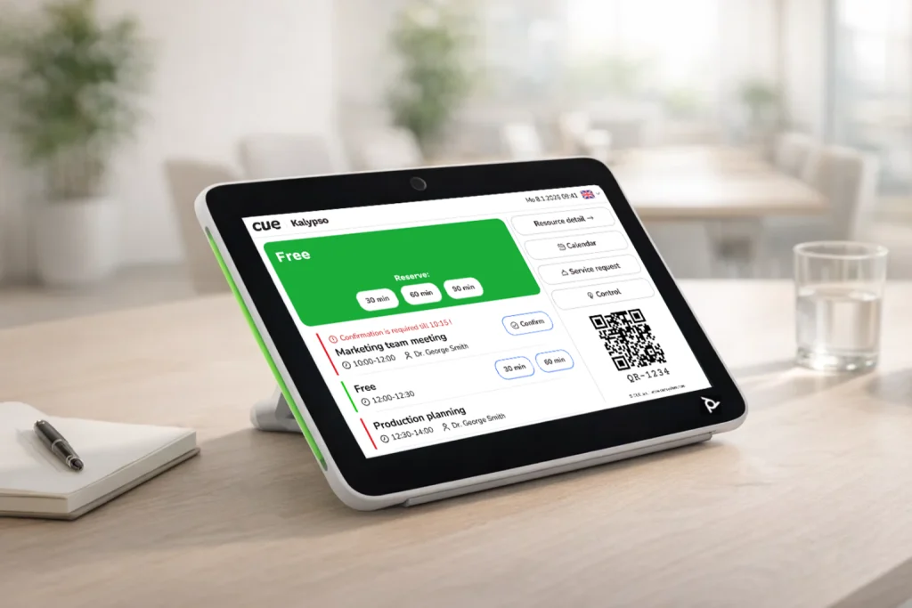 The room reservation application provides a clear, real‑time overview of a room’s availability and meeting status. Users can quickly reserve the room on the spot, extend or end an ongoing meeting, and view detailed room information, including photos and videos. The application also supports ordering additional services such as catering, technical support, or housekeeping. Beyond scheduling, the app integrates with the room’s control systems.