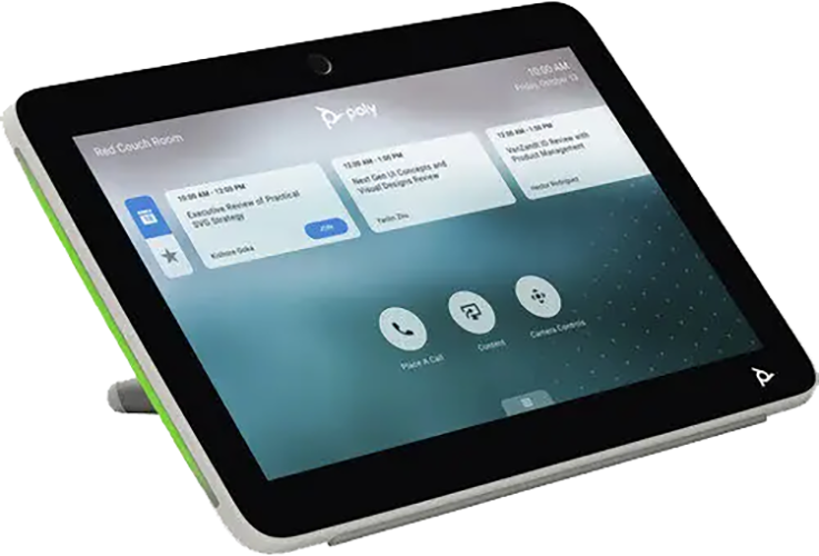 Poly TC8 and TC10 are modern touch-control panels that can be used not only for video conferencing but also as a central user interface for reserving a room and controlling other meeting-room technologies, such as displays, audio, lighting, heating, and air conditioning. This functionality is enabled through the AV Control feature, which allows integration of custom control interfaces via a web application.