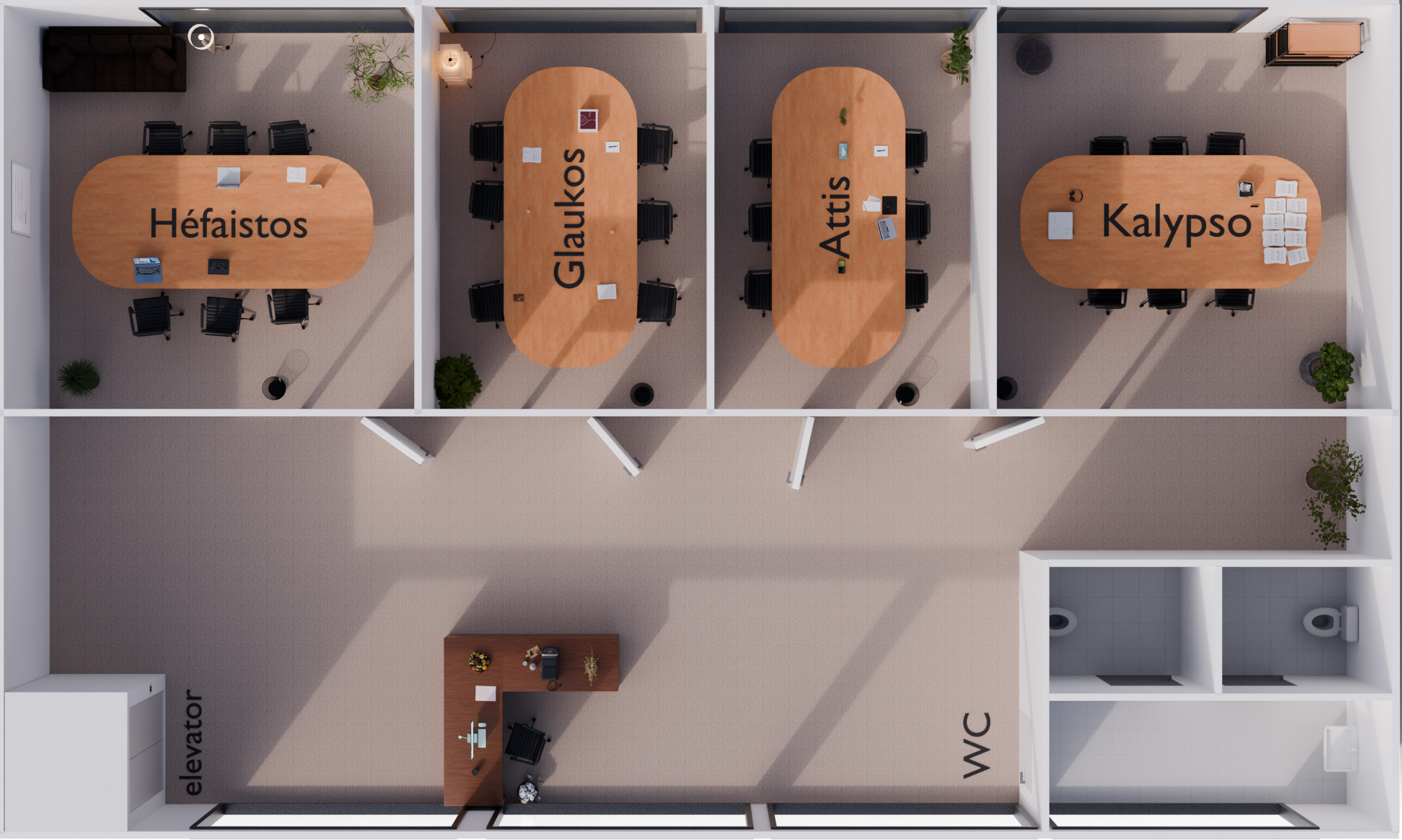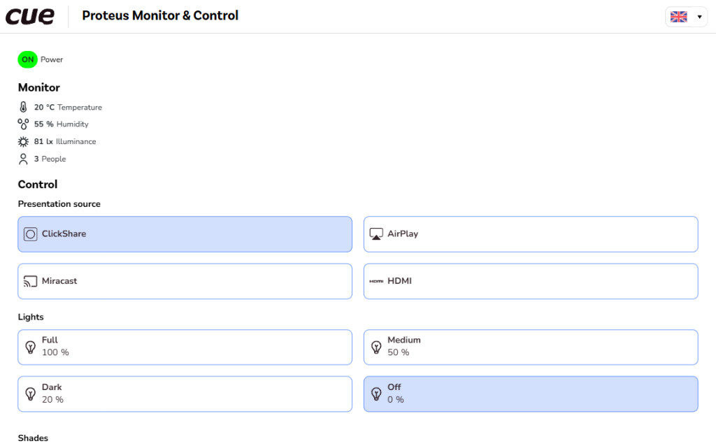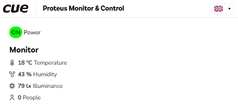 The Monitor part displays monitored values. The control system receives sensor data (e.g., temperature, humidity, CO2 level, and the presence and count of people) or monitors connected devices (e.g., displays, audio processors, videoconference, etc.).