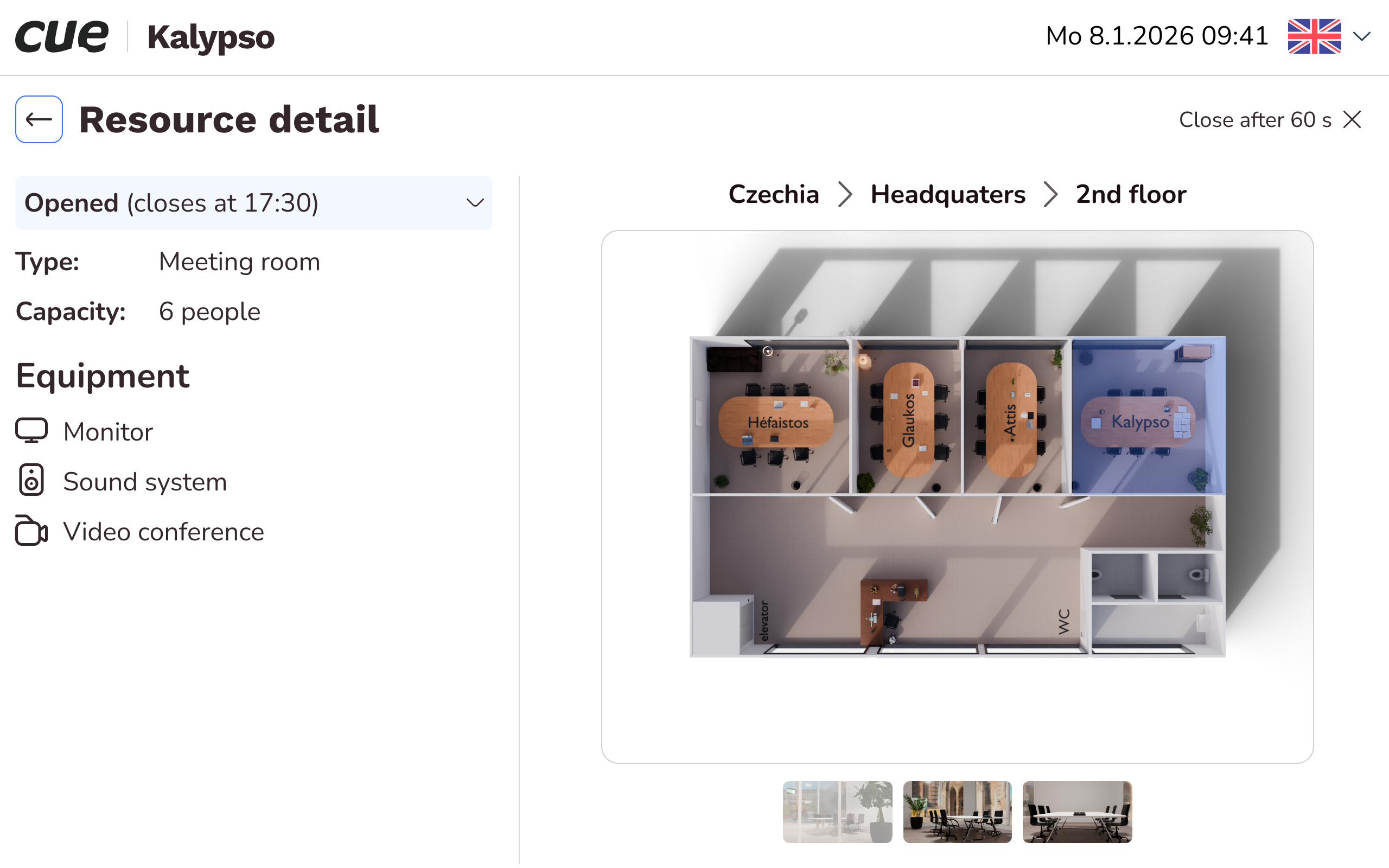 - Room details featuring photos, videos, and equipment information