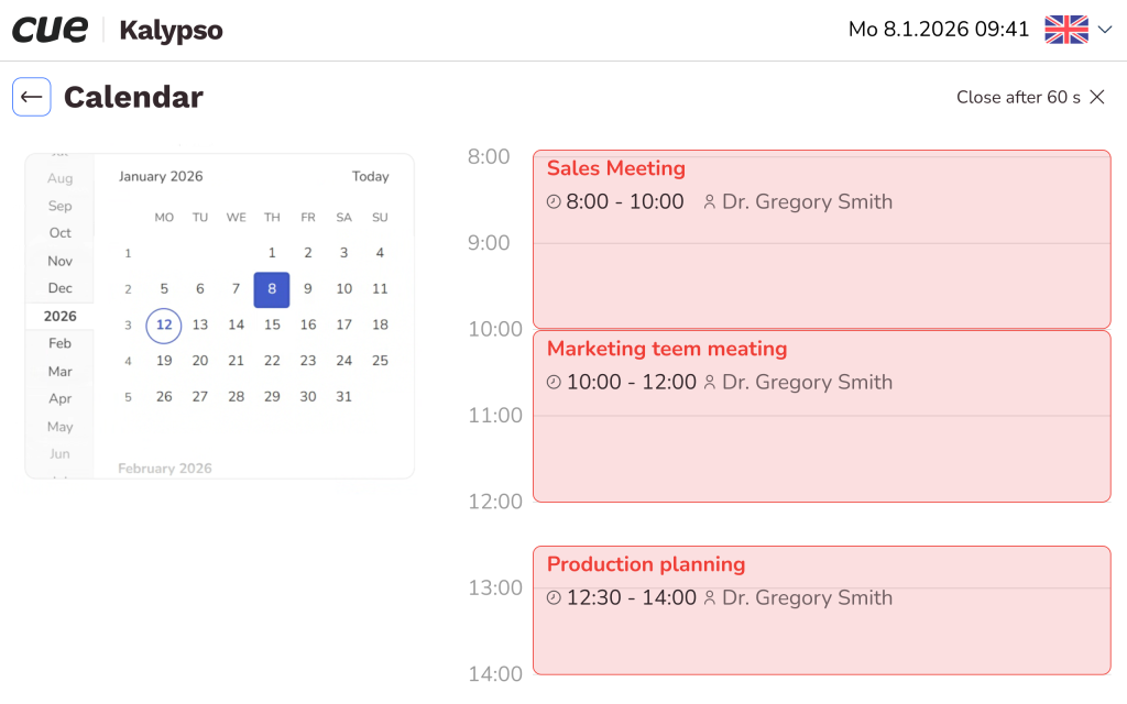 The room reservation panel application provides a clear, real‑time overview of a room’s availability and meeting status. Users can quickly reserve the room on the spot, extend or finish an ongoing meeting, and view detailed room information, including photos and videos. The application also supports ordering additional services such as catering, technical support, or housekeeping.