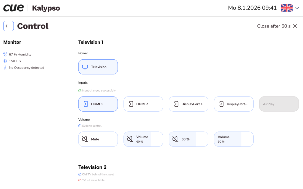 Beyond scheduling, the app integrates with the room’s control systems, allowing users to activate presets and manage AV equipment, lighting, HVAC, blinds, and other environmental settings directly from the panel. This creates a seamless, user‑friendly experience for managing both room bookings and room technology from a single interface.